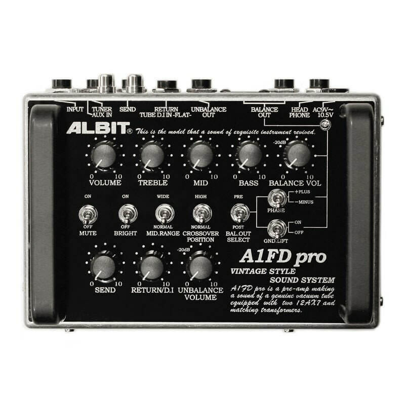 ALBITのA1FD proは、ヴィンテージ・チューブアンプのサウンドをコンパクトな筐体に凝縮したハンドメイドのチューブプリアンプ/ダイレクトボックスです。電源トランスを搭載し、約200Vの高電圧で12AX7真空管を2本駆動することで、豊かなダイナミックレンジと深みのあるサウンドを実現しています。主要部分はオーディオグレードの配線材を使用したハンドワイヤード方式を採用し、真空管で構成された独立型エフェクトループや、バランスアウトにマッチングトランスを使用するなど、細部にまでこだわった設計となっています。ギターとベースの両方に対応し、多彩な入出力端子とコントロールを備え、ライブやスタジオでの柔軟な音作りをサポートします。