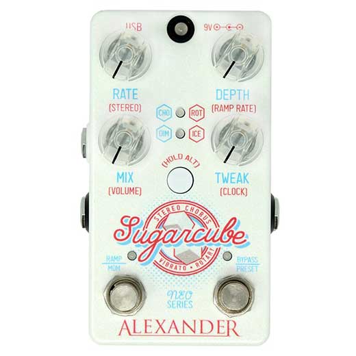 Sugarcube(シュガーキューブ)は、1980年代のスウィートなコーラス・サウンドをベースに革新的な機能を付け加え、新たなサウンドをデザインしたステレオ・コーラス/ヴィブラート/ロータリー・エフェクト・ペダルです。