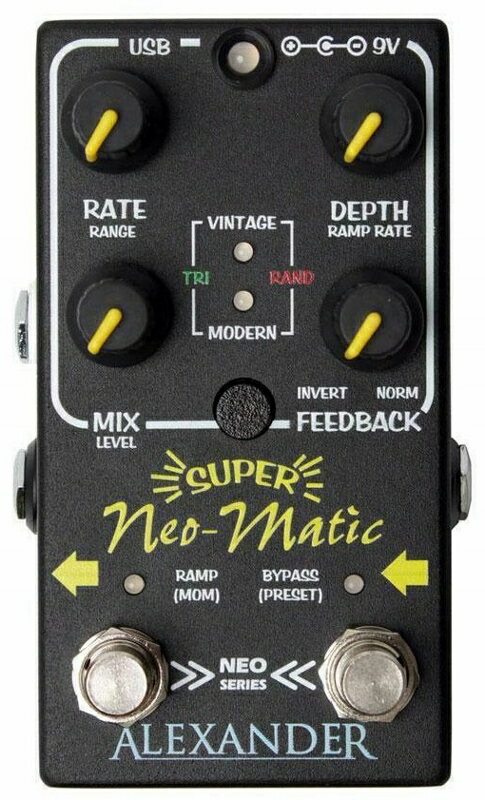 Alexander Pedalsの「Super Neo-Matic」は、1990年代に一時的に生産され、現在では入手困難となっているエフェクトペダルをモデルに開発されたデジタル・タイム・モジュレーターです。このペダルは、トライアングル波形とランダム波形の2種類のモジュレーションタイプを備え、コーラス、ヴィブラート、フランジングなどの多彩なエフェクトを実現します。