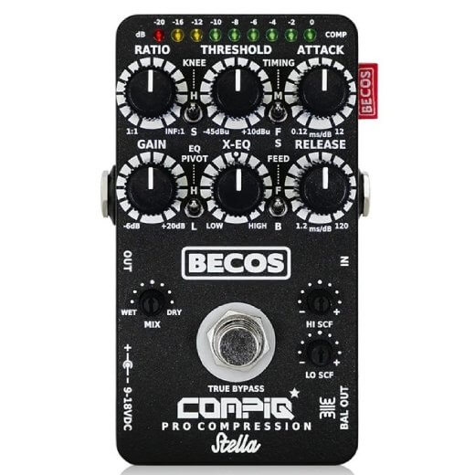 BECOS CompIQ STELLA Pro Compressor MkIIは、THAT 4320 アナログエンジン搭載のスタジオ品質コンプレッサーをペダルボードに収まるサイズで実現。Ratio, Threshold, Attack, Release, Gain, X‑EQ, Dry/Wet Mix, Saturation, サイドチェインフィルターなど豊富なパラメータを装備し、Feed‑Forward/Feed‑Backの2モード選択やハード/ソフトニー切替も可能。バランスDI出力(DITOSオプション)対応、LEDメーター搭載で視認性◎。透明〜チューブライクな圧縮感まで幅広い音作りが可能な、演奏・録音の両現場で活躍するプロ向けコンプです。