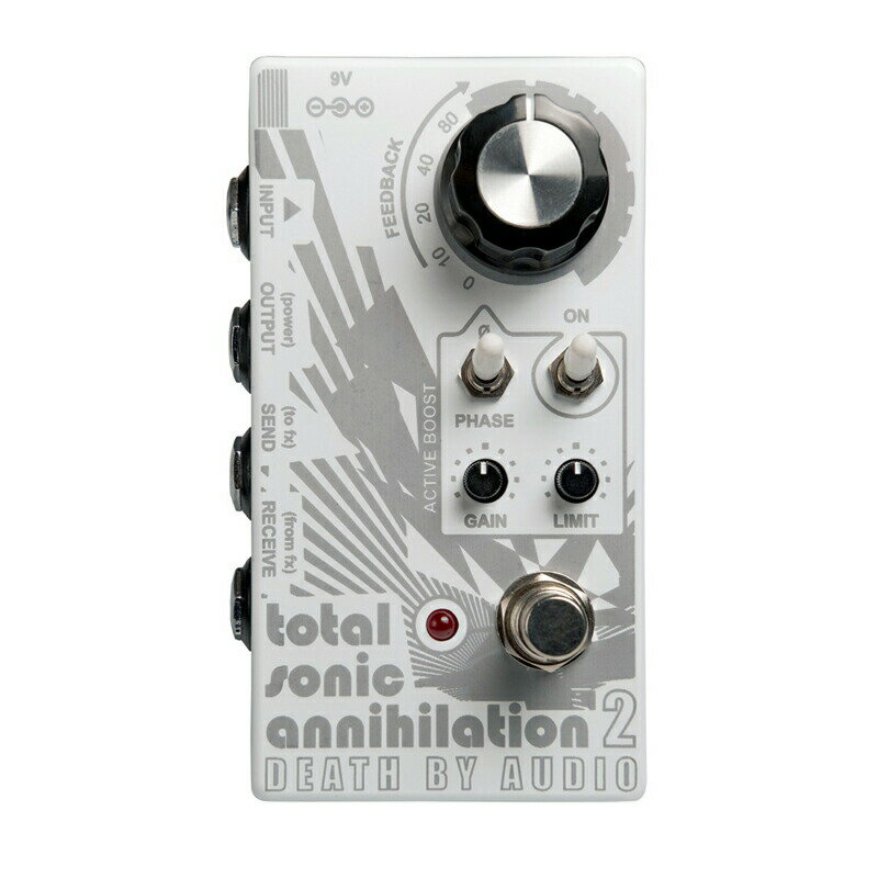 Death By Audioの「Total Sonic Annihilation 2 (TSA2)」は、エフェクトループ内のペダルの出力を再び入力に戻し、意図的にフィードバックを発生させることでサウンドを劇的に変化させるフィードバックルーパーペダルです。この革新的なツールは、エフェクターのトーンを極限まで歪曲・増幅させ、従来では到達できないクリエイティブなサウンドを生み出します。