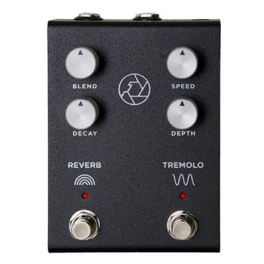 9VDC入力(200mA)ながら内部は18Vのヘッドルームを確保し、余裕のあるダイナミクスを実現。リバーブはBlend/Decay、トレモロはSpeed/Depthの4ノブ構成で、両エフェクトは独立オン/オフに対応。背面トリムポットでトレモロ出力の微調整も可能です。