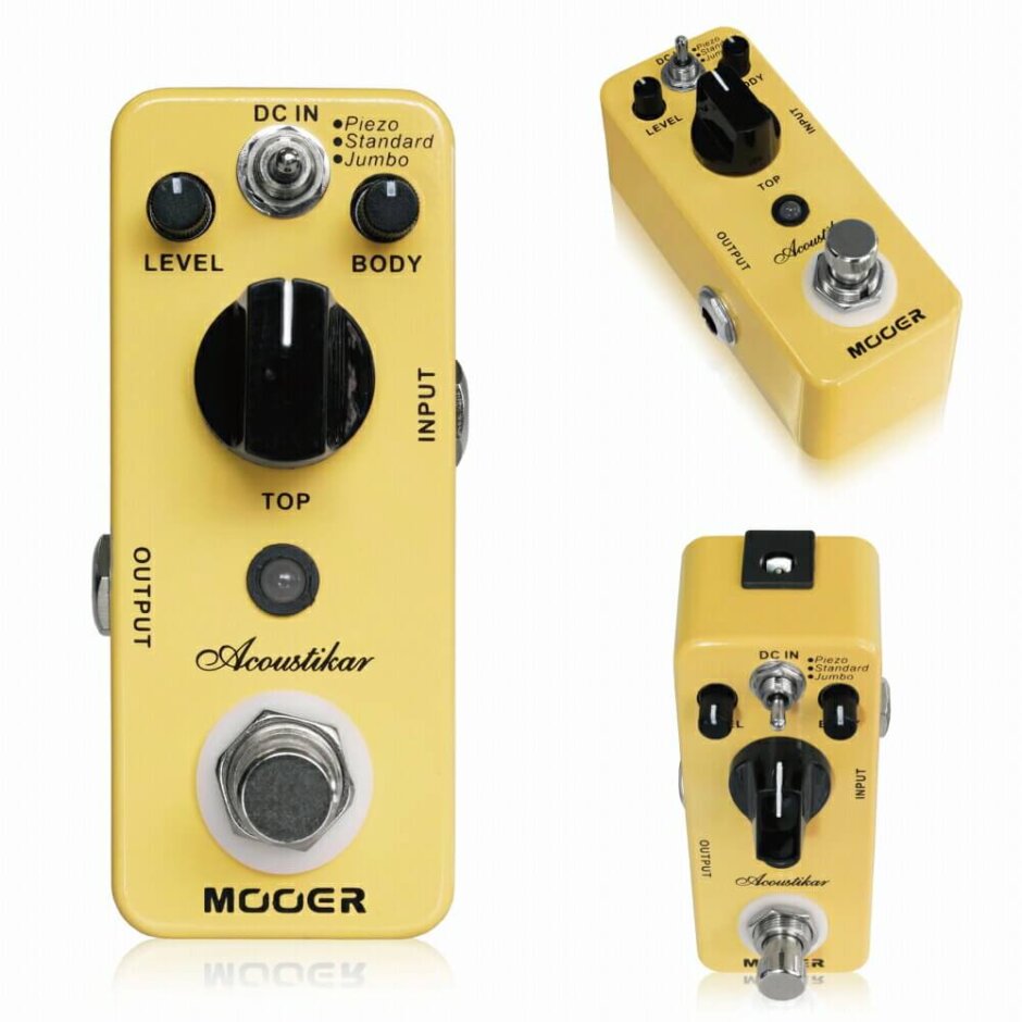 Mooer Acoustikarは、エレキギターの音色をアコースティックギターのサウンドに変換するコンパクトなエフェクターペダルです。3つのモード(Piezo、Standard、Jumbo)を搭載し、ピエゾピックアップのクリアな音色から、スタンダードなアコースティックギター、ジャンボボディの豊かな低音まで、多彩なアコースティックサウンドを再現します。