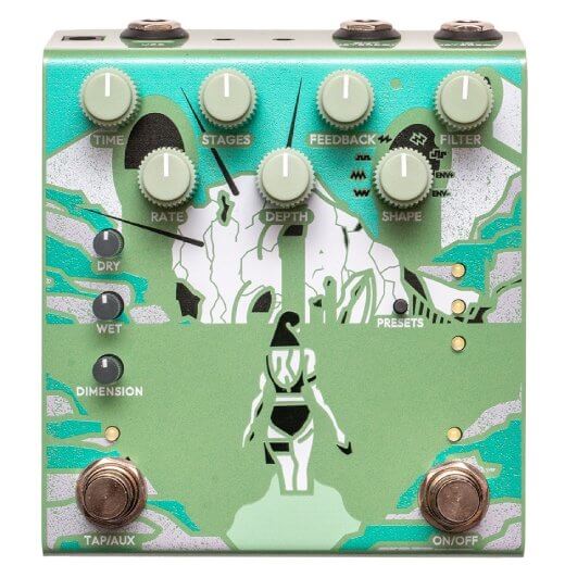 TRSステレオI/O(モノイン→ステレオ可)、アナログドライスルー、トレイル/トゥルーバイパス、プリセット保存、全パラメータのEXP/MIDI制御(MIDIクロック対応)、ソフトタッチフットスイッチ搭載。9VDC/350mA、電池非対応。