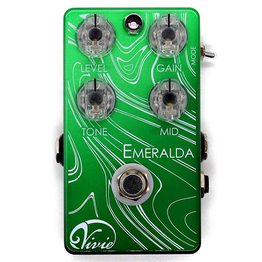 EMERALDAは、トランスペアレント系のオーバードライブで、TONE/MIDに加え、サイドのスイッチでクリーンミックス回路に関連した2モードの切り替えが可能。