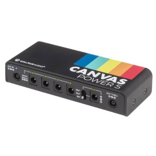 Canvas Power 5 には、9Vで最大500mAのクリーンな電力を供給する 5つの独立した電源出力があります。うち1つは可変電圧で、9V、12V、18Vを切り替えて高電圧ペダルに電力を供給できます。