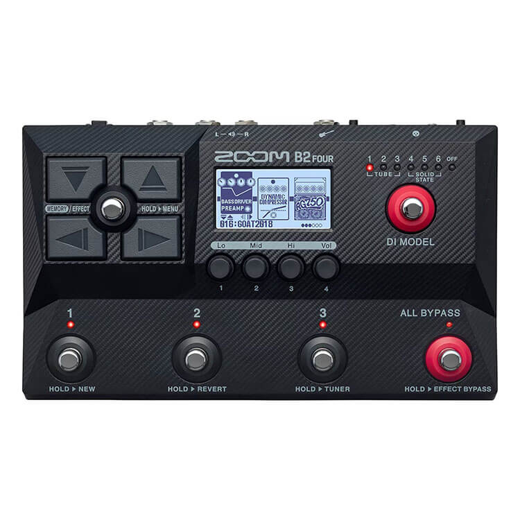 ZOOM B2 FOURはプロ定番のダイレクトボックス 6機種を再現するDI MODEL機能とXLR出力を搭載した、ベース用エフェクター&アンプエミュレーター。