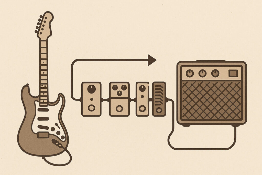基本の並びは、ギター → チューナー → ブースター → オーバードライブ → ディストーション → ディレイ → アンプ。ブースターの位置をオーバードライブの後ろに変えて、「音量アップ用」にするのも定番です。