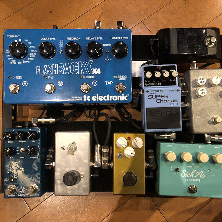 Sick Asと自作のMO-Dが決め手となっています。MO-Dの本家は高価で手が出なかったため、少しアレンジを加えながら自作しました。どちらも太さはありながらバンドサウンドのなかでも埋もれない、絶妙な歪み方をしてくれます。Sick AsとShredmasterの順番に悩んだのですが、自作のShredmasterの守備範囲が広く、最初にかませると後段の歪みの乗りが非常にきれいになるので、イレギュラーな使い方ではありますがクリーンブースターとして使っています。