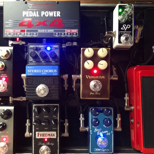 パワーサプライは世界標準のpedal power 4×4を使用少し太さを感じます、全部アイソレートなのもありノイズは一切ないです。