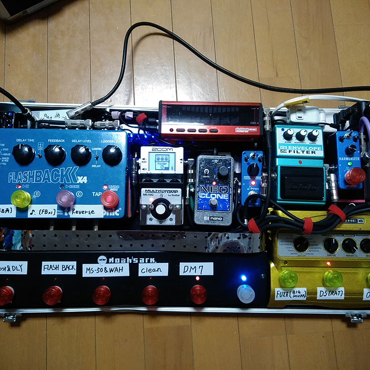 定番、安価ブランド、名器、オリジナルと統一感のない組み合わせですが、これ1つで歪みからクリーン、飛び道具的な音色までスタジオやライブで必要な音を全て出せます(^^♪