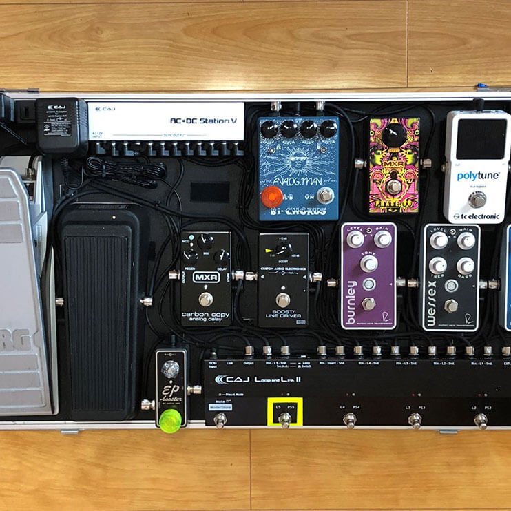 音を聞いた瞬間、心を奪われて3つもインストールしちゃいました。後は、定番物とハイエンド物を入れてます。チューナーも立った時に見やすいように角度をつけたのもポイントです。Crybaby/GCB-95は、トゥルーバイパス仕様に改造し、ON/OFFのLEDもつけました。このボードがあれば自分好みの音が、どこの場所でも出せるように組み上げました。