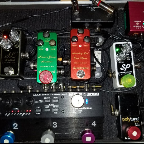 SL DriveをPGSでブーストしたディストーションと、SRODを浅めの歪みをMS-3のループで使い分け、ソロの時にSPコンプとMS-3内でのEQと音量アップをしています。