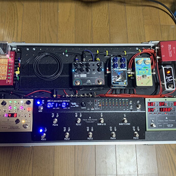 ラルクのコピーバンドでライブするために構築したボードです。核となるARC-4を導入、ディレイを2台にし、符点8分用に、バンドのタイムをマイクで拾いディレイタイムを変えるFT-2Y、モジューレションをかけたりソロで使うFF-1Y-Kとしました。ソロやイントロのブーストはARC-4内臓のアウトプットブーストとディレイの原音ブーストを使い分けて細かい音量差をつけています。
