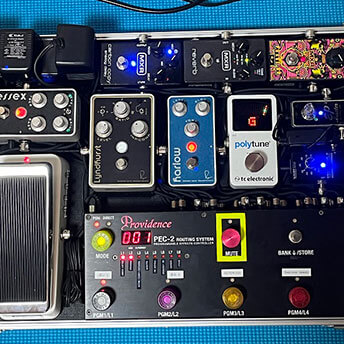 アナログマンのコーラスも2系統あり2台のコーラスがあるイメージでアルペジオ用、コンプとの合わせ技でカッティング用等重宝しています。Xoticのワウはスイッチャー前にありどの場面でも踏めばワウサウンドが得られます。信号はジャンクションボックスを出てEP booster(18V)→ワウ→スイッチャーに入り順番は、LOOP1にLyndhurst LOOP2にwessex LOOP3にburnley LOOP4にharlow LOOP5にphase90 LOOP6にBI-chorus LOOP7にreverb LOOP8にdelay、スイッチャーを出てボリュームペダル→ジャンクションボックスとなります。ノイズリダクションは、ディストーションの後に繋げています。