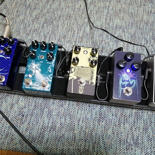 最初にlovepedal Eternityのクローンで音を整え、必要に応じて385でしっかりと歪みをつけています。