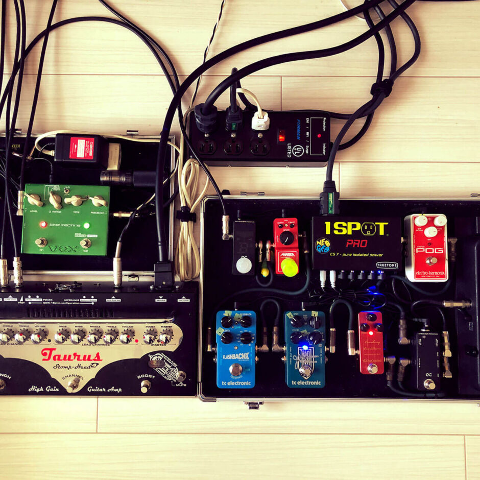 【2022年5月 UPDATE】どのエフェクターもOFFの状態(ALL BYPASS)で演奏する割合が一番多いのでバイパス音には気を使っています。エフェクターのバイパス音は、その1個前と1個後ろが何か(トゥルーバイパスかバッファードバイパスか)で音(信号の強さ)が微妙に変化するので、繋げる順番やバイパス方式を選べるエフェクターはその選択を単体ではなく全部繋げたまま、音を出しながらチェックしてみた。その結果、順番を入れ替えたりインプットバッファーをONに切り替えたものが出てきた。結果論ですがトゥルーバイパス、バッファードバイパスがほぼ交互に並ぶ感じになりました。