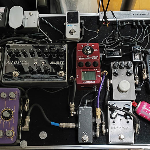 このボードの1番のポイントはアルビットのa1bp pro mark2です。真空管搭載のプリアンプでベースの原音を損なわずに真空管の温かみのある音に変化さしてくれるボード内の心臓部です。次はコンプと歪みです。コンプはとりあえずebsマルコンで済ましています。歪みはかけっぱなしでも使えるsound frog ベリアル ガッツリ歪ませるときに使う b3k v2 が歪みとコンプです。その次はワウです。source audio sa143は今は遊びて使ってるだけですが、やる曲によっては活躍するので持ってて損は無いです。他は電源タップを入れたのとパワーサプライをノイズ対策とスペース確保のためcaj dcdc station 2 に変えました。長文による説明失礼しました。