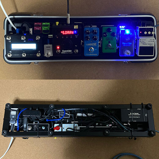 スイッチャーが嫌いな直列派です。バブル期にブラッドショーでH3000、TC2290、3+SE等のラックシステムをイジり倒して来たので飽きて今はシンプル派です。裏側のCAJのDCステーションを母体にしてRJMのバッファーを入口にエンハンサー、EPブースターを経由して表側のNS-2、シグマエッジとGT-ODで歪みを使い分けて、空間系のtc、H9に繋がります。MORNINGSTARでMIDI制御し、MXRのタップスイッチでページチェンジします。strymonも各種使いますが、綺麗過ぎ(笑)。昭和39年生まれは、Eventide、LEXICONといったアナログライクな太っとい音に洗脳されていますのでこういったチョイスになります^^*