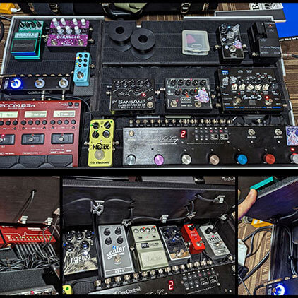 ワイヤレス→バッファー→スイッチャー(プリアンプ×3、歪み×4の組み合わせをコントロール)→フェイザー→マルチ→遊びループ→アンプの接続順です。