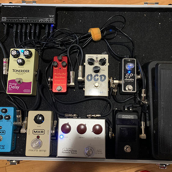 歪みは3つ。ワンコンのstrawberryとOCDとStudio DaydreamのkcワウペダルはJIM DUNLOP CRY BABY 95Q 。スイッチレスでブーストもあり便利です。