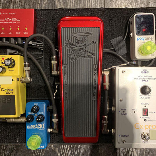 ワウはCryBaby(GCB-95)をトゥルーバイパスにモディファイしたものをずっと使用していましたが,最近バッファードバイパスの良さを再認識し,サウンドも気に入ったためSLASHモデルへ変更しました。