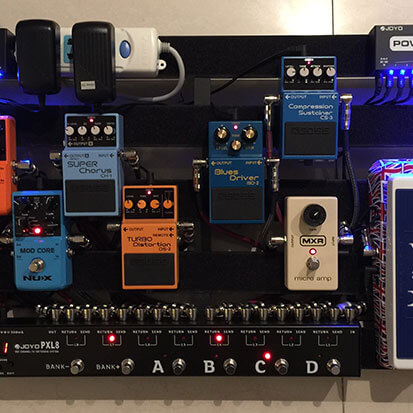 ワウがVOXの限定品(V847-A UJ)だというのがポイントで、歪み系が3種類(Blues Driver、TURBO Distortion、Micro amp)を使い分けできるようにJOYO PXL8を最大限生かすことを考えました。あとNUXのMOD COREは1台で8種類のモジュレーションが使えるから、SUPER Chorusとの組み合わせでバリエーションが豊富な事もこのボードの特徴だと思っています。