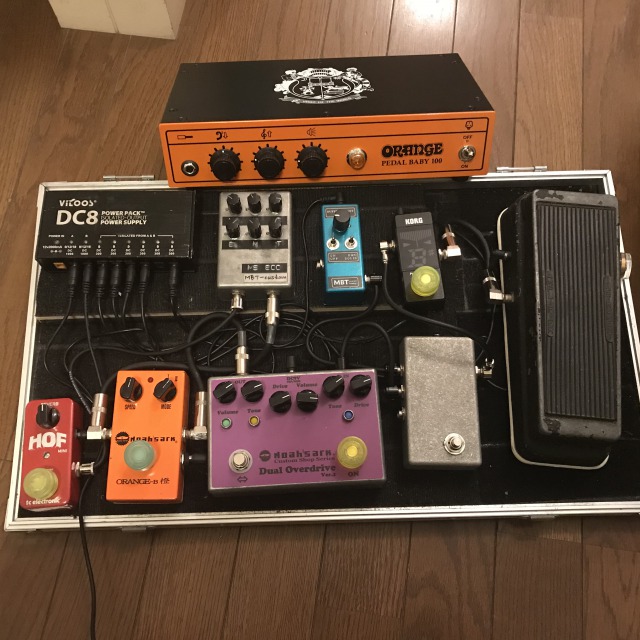 OverDriveはノアズアーク製のDual OverDriveでGreen Chをメインに掛けっぱなしで使いつつ、Orange Chを要所要所ニュアンス違いの音が欲しい際に隠し味的に使用しています。